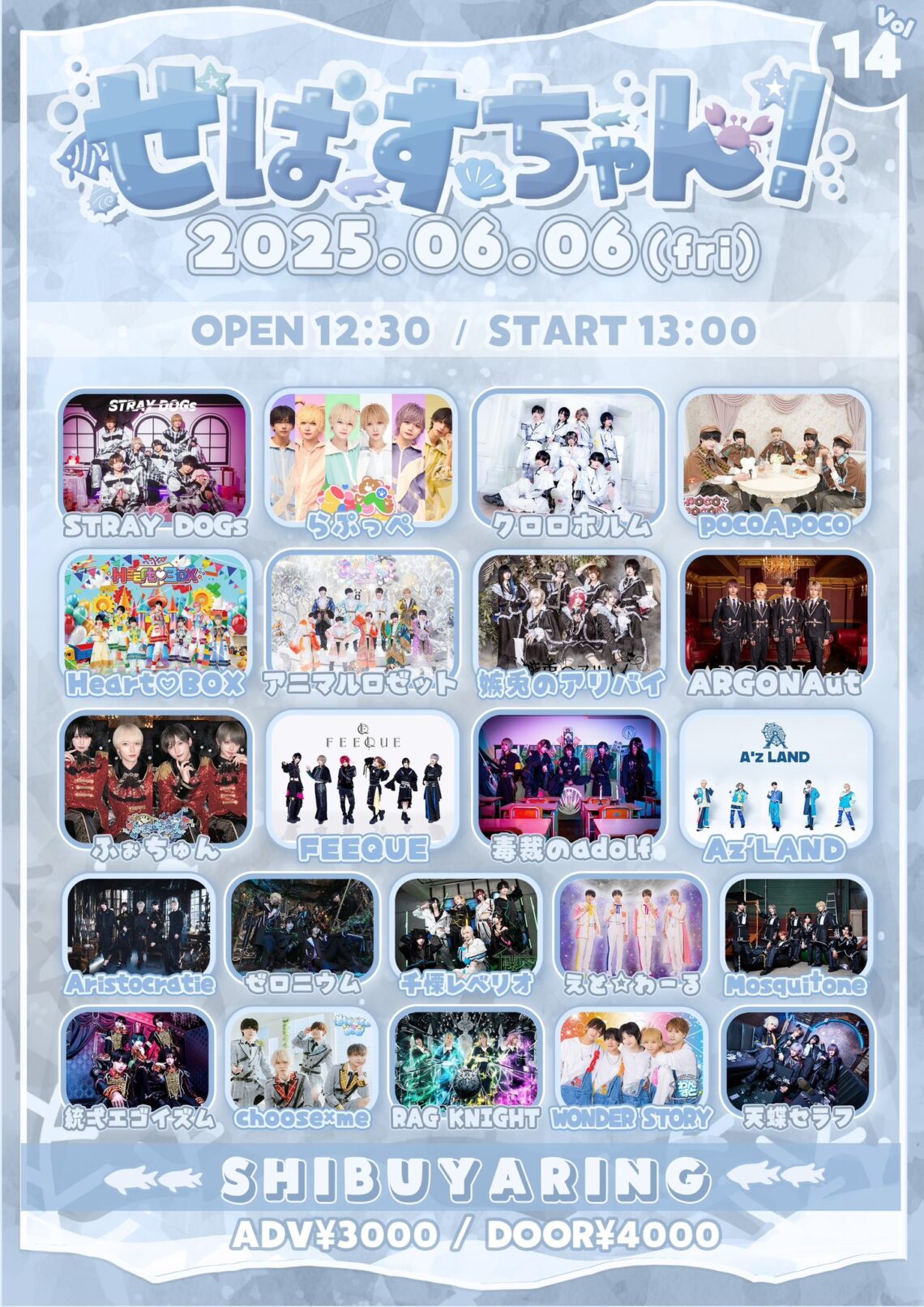 ▶︎出演:天蝶セラフ / WONDER STORY / RAG KNIGHT / choose×me / 統弌エゴイズム / Mosqui T one / えと⭐︎わーる / 戦慄レベリオ / ゼロニウム / Aristocratie / Az’LAND / 毒裁のadolf / FEEQUE / ふぉちゅん / ARGONAut / 嫉兎のアリバイ / アニマルロゼット / Heart♡BOX / pocp a poco / クロロホルム / らぶっぺ / STRAY DOGs