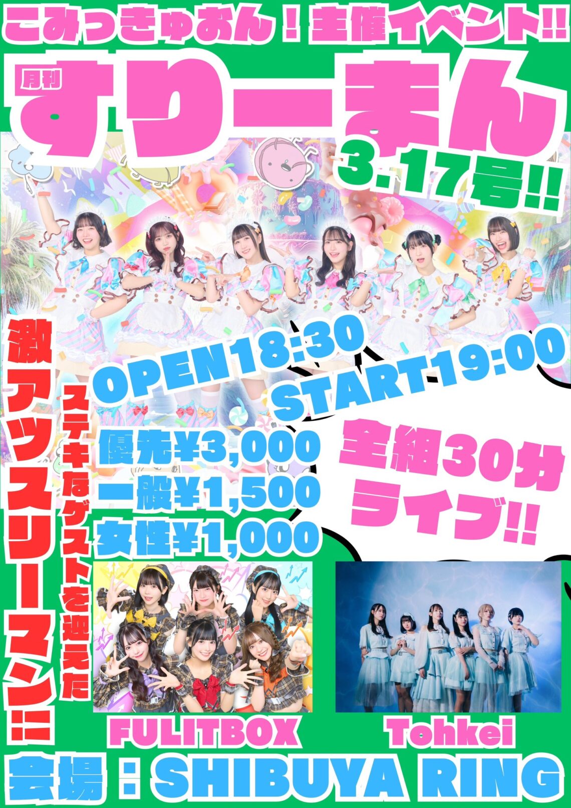 3/17(月) こみっきゅおん!主催イベント月刊すりーまん3/17号 会場:渋谷RNG 開場:18:30 開演:19:00 料金:優先入場チケット¥3,000 一般チケット¥1,500 女性¥1,000 (入場時1ドリンク必須) 出演者 こみっきゅおん! ゲスト:FULIT BOX / Tohkei