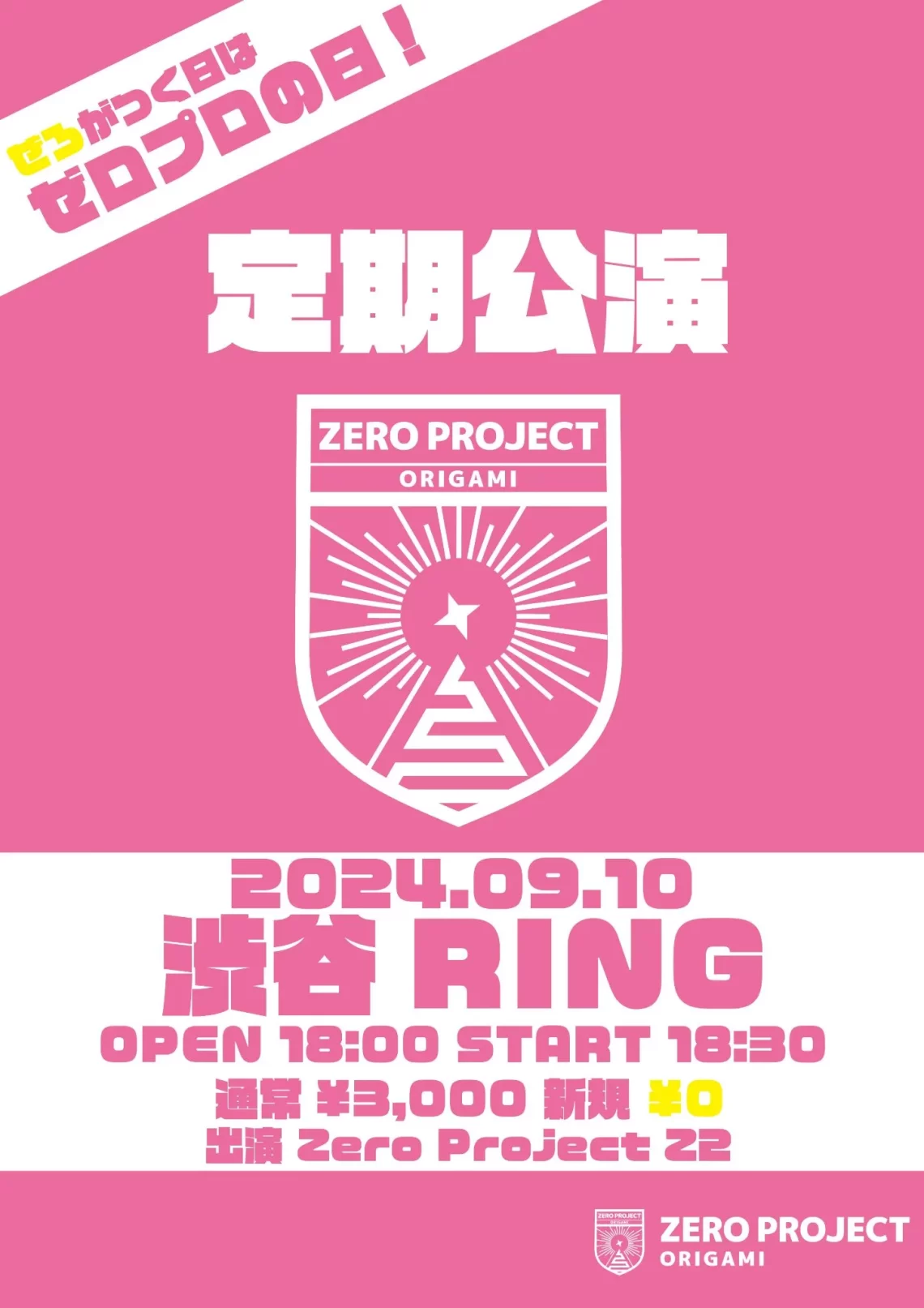 ※概要が最新ではない場合がございます。主催公式もご確認お願いいたします。 9月10日(火) Zero Project 定期公演 Z2 @渋谷RING 〒150-0043 東京都渋谷区道玄坂2-21-7 第8矢澤ビル2F/3F 出演グループ Zero Project Z2 開場18:00開演18:30 *お時間ですが多少前後する恐れがあります。 チケット代 通常 3,000円 新規 0円 別途でドリンク代がかかります。 ※整理番号順入場 開場15分前頃より整列を開始致します。開場後にお並びいただいた方は整列順でのご案内となります。 ※前売入場が終わり次第で当日券の方のご入場を開始いたします。(当日券は入場制限人数に達した場合はお並び頂いていてもご入場頂けない可能性がございます。) ※前日また早朝からの整列場所取りは禁止とさせていただきます。 ※メンバーマスク無し特典会(事務所側の任意) ※小学生以上要チケット ※オールスタンディング ※ご入場時に別途ドリンク代をいただきますのでご了承ください(アルコール飲料の提供はいたしません)