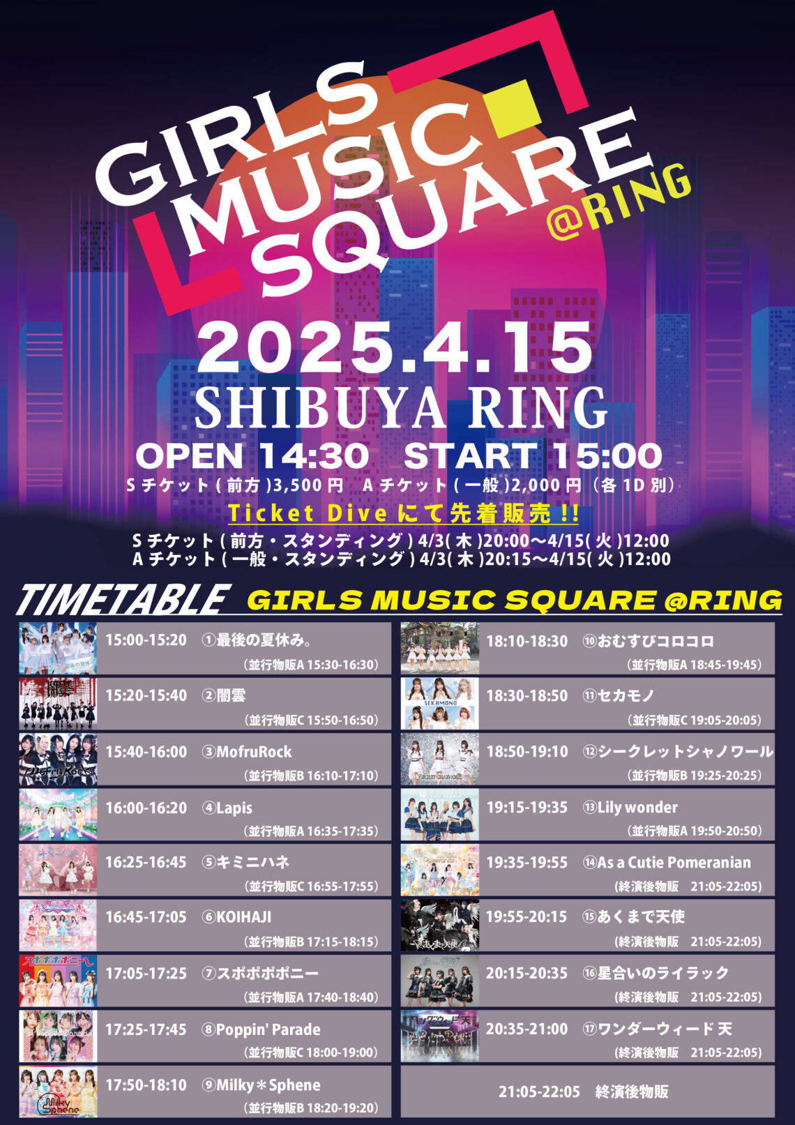 ■タイトル『GIRLS MUSIC SQUARE @RING 』 ■会場 SHIBUYA RING ■時間 開場14:30 開演15:00 ■料金 Sチケット(前方・スタンディング)3,500円 Aチケット(一般・スタンディング)2000円 (各1D) ■販売 Ticket Dive 先着販売 Sチケット(前方・スタンディング) 4/3(木)20:00〜4/15(火)12:00 Aチケット(一般・スタンディング) 4/3(木)20:15〜4/15(火)12:00