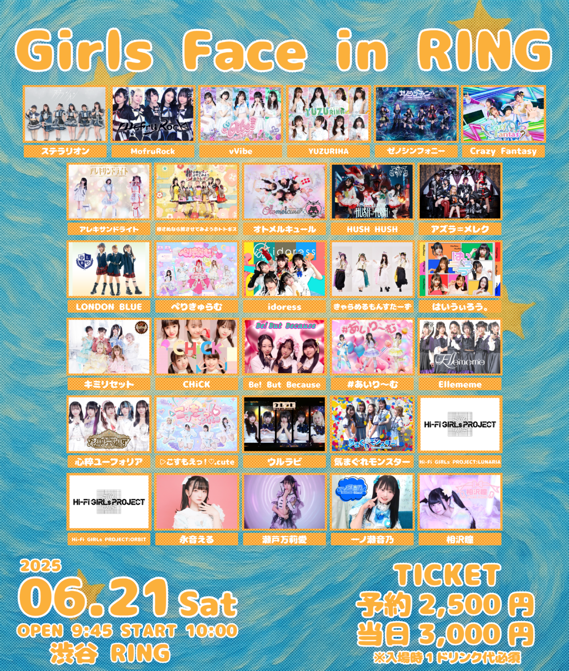 ステラリオン / MofruRock / vVibe / YUZURIHA / ゼノシンフォニー / Crazy Fantasy / アレキサンドライト / 推さぬなら推させてみようホトトギス / オトメルキュール / HUSH HUSH / アズラ=メレク / LONDON BLUE / ぺりきゅらむ / idoress / きゃらめるもんすたーず / はいうぃろう。 / キミリセット / CHiCK / Be! But Because / #あいり~む / Ellememe / 心粹ユーフォリア / ▷こすもえっ!♡.cute / ウルラビ / 気まぐれモンスター / Hi-Fi GIRLs PROJECT:LUNARIA / Hi-Fi GIRLs PROJECT:ORBIT / 永音える / 瀬戸万莉愛 / 一ノ瀬音乃 / 相沢瞳