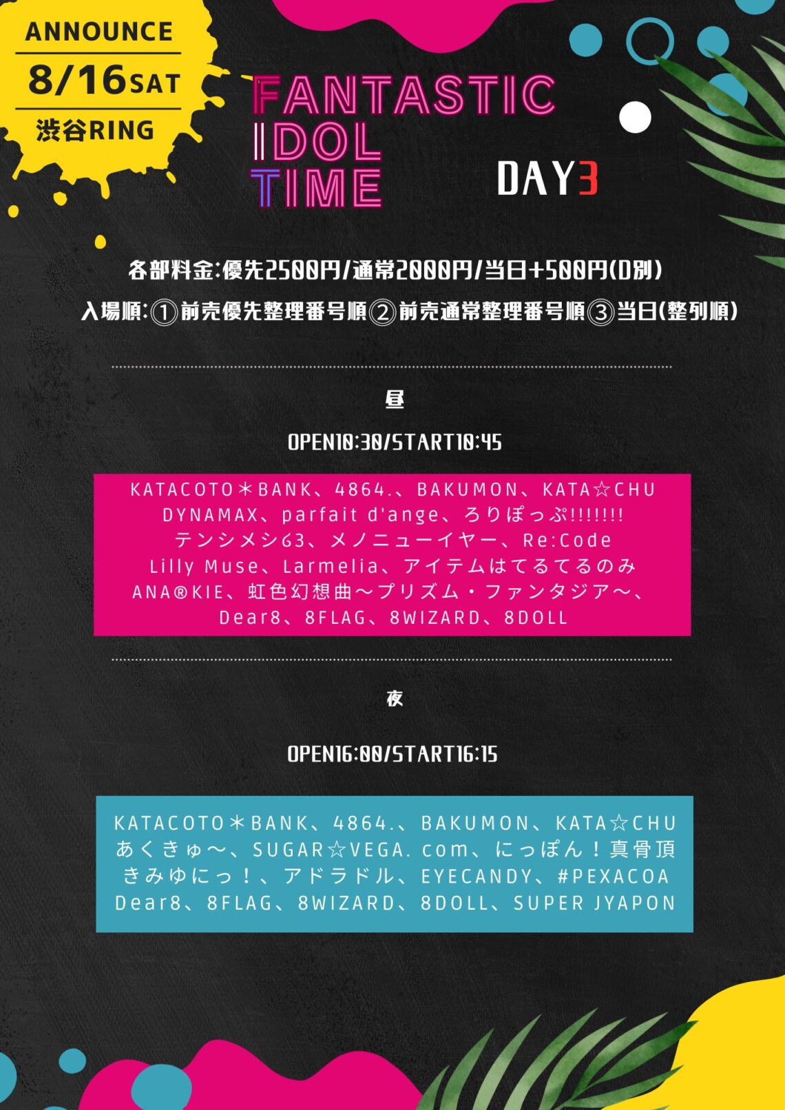 ▼出演:KATACOTO*BANK、4864.、BAKUMON、KATA☆CHU、DYNAMAX、parfait d’ange、ろりぽっぷ!!!!!!!、テンシメシ໒3、メノニューイヤー、Re:Code、Lilly Muse、Larmelia、虹色幻想曲〜プリズム・ファンタジア〜、ANA®KIE、アイテムはてるてるのみ、Dear8、8FLAG、8WIZARD、8DOLL